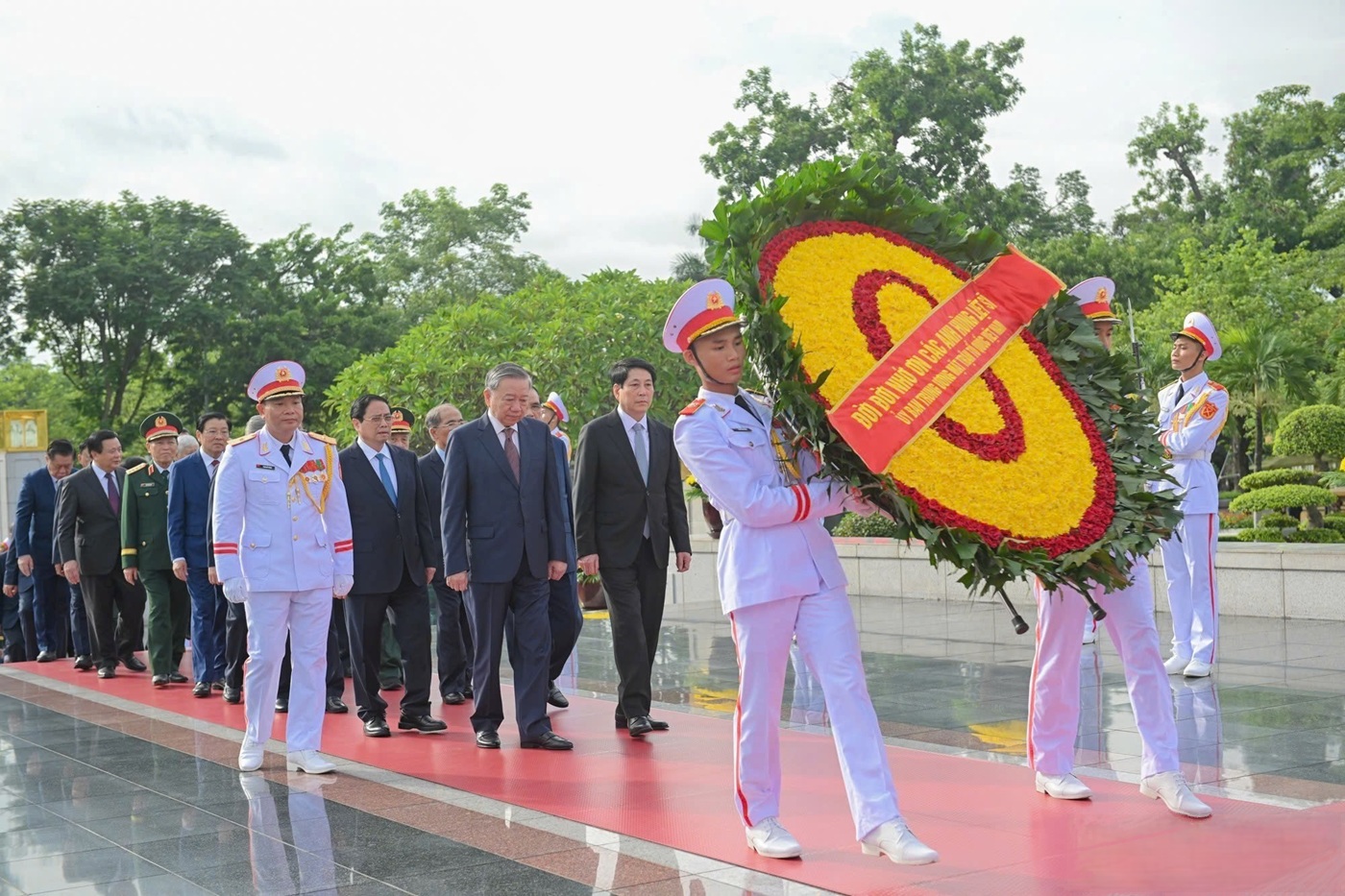 Tổng Bí thư Tô Lâm, Chủ Tịch nước Lương Cường, Thủ tướng Phạm Minh Chính cùng các đồng chí lãnh đạo, nguyên lãnh đạo Đảng, Nhà nước đến đặt vòng hoa, dâng hương tưởng niệm các Anh hùng liệt sĩ tại Đài tưởng niệm các Anh hùng liệt sĩ (đường Bắc Sơn, Hà Nội), ngày 24-7-2025_Ảnh: nhandan.vn