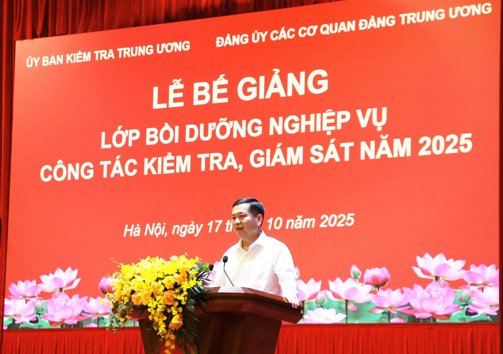 XDĐ - Ngày 17-10, tại Hà Nội, Ban Thường vụ Đảng ủy các cơ quan Đảng Trung ương phối hợp Ủy ban Kiểm tra Trung ương tổ chức Lễ bế giảng lớp bồi dưỡng nghiệp vụ công tác kiểm tra, giám sát năm 2025.