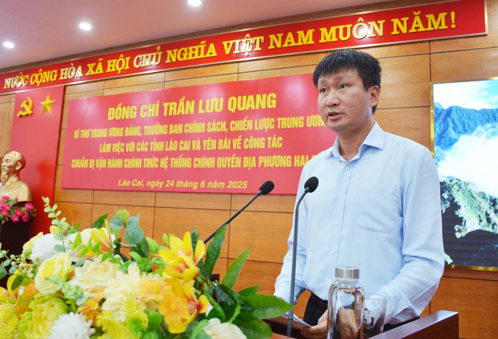 Tại buổi làm việc, đồng chí Trần Huy Tuấn, Bí thư Tỉnh ủy Yên Bái báo cáo kết quả triển khai chuẩn bị vận hành hệ thống chính quyền 2 cấp tại Lào Cai và Yên Bái.
