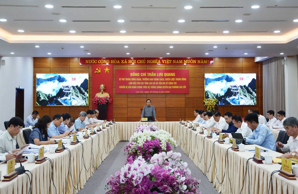 XDĐ - Ngày 24-6-2025, tại Lào Cai, Đoàn công tác Trung ương do đồng chí Trần Lưu Quang, Bí thư Trung ương Đảng, Trưởng Ban Chính sách, Chiến lược Trung ương làm Trưởng đoàn, làm việc với lãnh đạo 2 tỉnh Lào Cai và Yên Bái về công tác chuẩn bị vận hành chính thức hệ thống chính quyền địa phương 2 cấp.