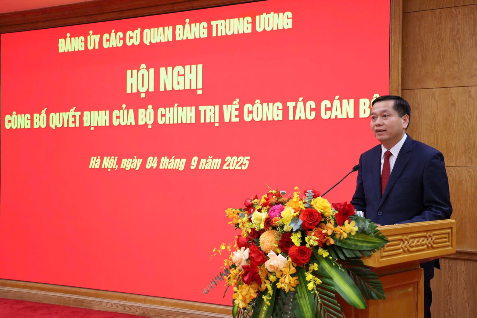 XDĐ - Ngày 4-9-2025, tại Hà Nội, Đảng uỷ các cơ quan Đảng Trung ương tổ chức Hội nghị công bố quyết định của Bộ Chính trị về công tác cán bộ. Đồng chí Trần Cẩm Tú, Ủy viên Bộ Chính trị, Thường trực Ban Bí thư, Bí thư Đảng uỷ các cơ quan Đảng Trung ương chủ trì hội nghị.