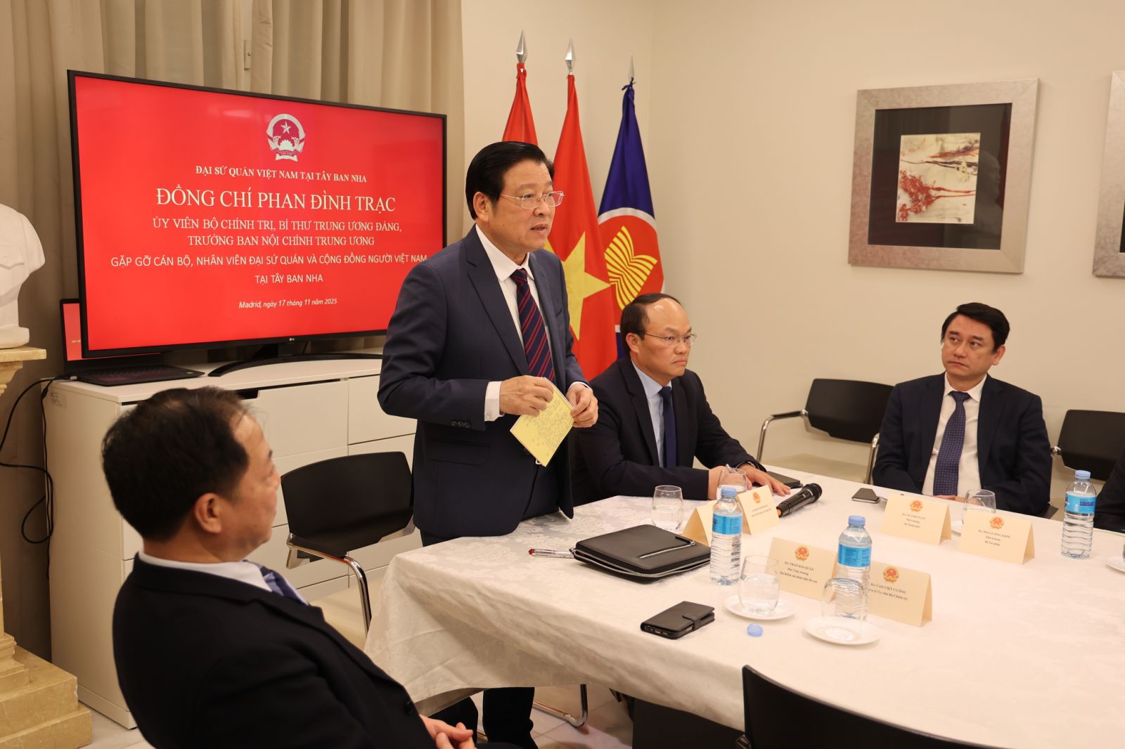 Trao đổi với cán bộ, nhân viên Đại sứ quán Việt Nam và đại diện cộng đồng người Việt Nam tại Tây Ban Nha, đồng chí Phan Đình Trạc đã thông tin đến bà con một số thành tựu nổi bật của đất nước trong thời gian qua trong các lĩnh vực phát triển kinh tế, an sinh xã hội, đối ngoại, cải cách và tinh gọn bộ máy hành chính và một số chủ trương lớn của Đảng ta về khoa học công nghệ, giáo dục đào tạo, chăm sóc sức khỏe nhân dân, phát triển kinh tế tư nhân, công tác xây dựng pháp luật, phòng chống tham nhũng...