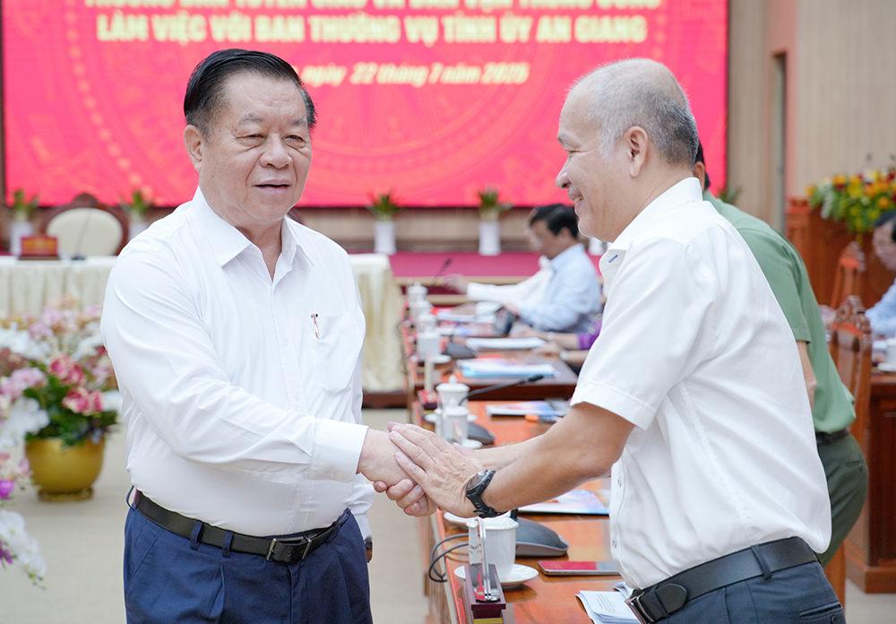 XDĐ - Ngày 22-7-2025, đoàn công tác do đồng chí Nguyễn Trọng Nghĩa, Ủy viên Bộ Chính trị, Bí thư Trung ương Đảng, Trưởng Ban Tuyên giáo và Dân vận Trung ương làm Trưởng đoàn có buổi làm việc với Ban Thường vụ Tỉnh ủy An Giang về kết quả thực hiện nhiệm vụ chính trị trên địa bàn.