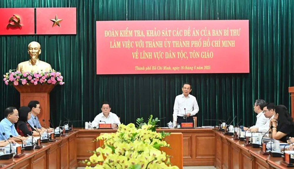XDĐ - Ngày 16-6-2025, tại thành phố Hồ Chí Minh, Đoàn công tác của Trung ương do đồng chí Nguyễn Trọng Nghĩa, Ủy viên Bộ Chính trị, Bí thư Trung ương Đảng, Trưởng Ban Tuyên giáo và Dân vận Trung ương, Trưởng Ban Chỉ đạo tổng kết các đề án của Ban Bí thư, làm Trưởng đoàn, đã có buổi làm việc với Thành ủy thành phố Hồ Chí Minh về lĩnh vực dân tộc, tôn giáo.