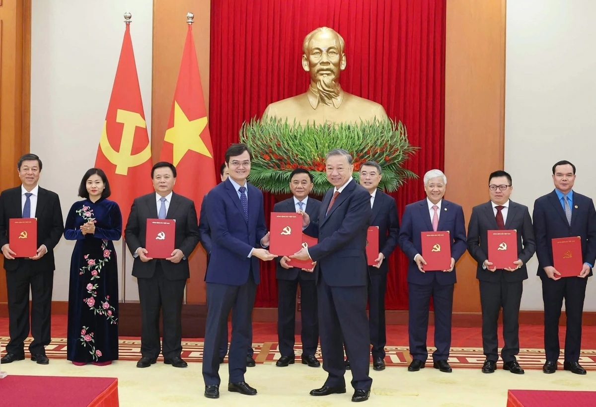 Tổng Bí thư Tô Lâm trao trao quyết định của Bộ Chính trị cho đại diện 13 cơ quan Đảng, đoàn thể Trung ương hoàn thành sắp xếp, tinh gọn tổ chức bộ máy, ngày 30-12-2024_ Ảnh: TTXVN