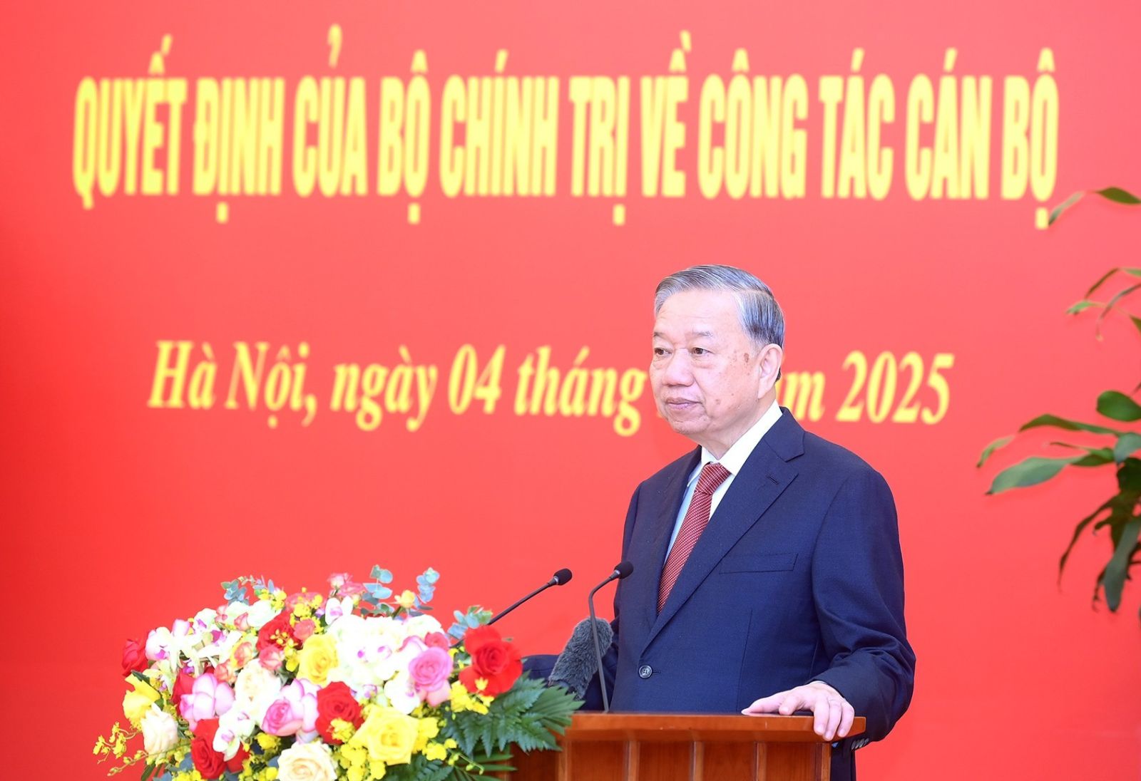 Tổng Bí thư Tô Lâm và các đồng chí lãnh đạo Đảng, Nhà nước dự lễ công bố các quyết định của Bộ Chính trị.