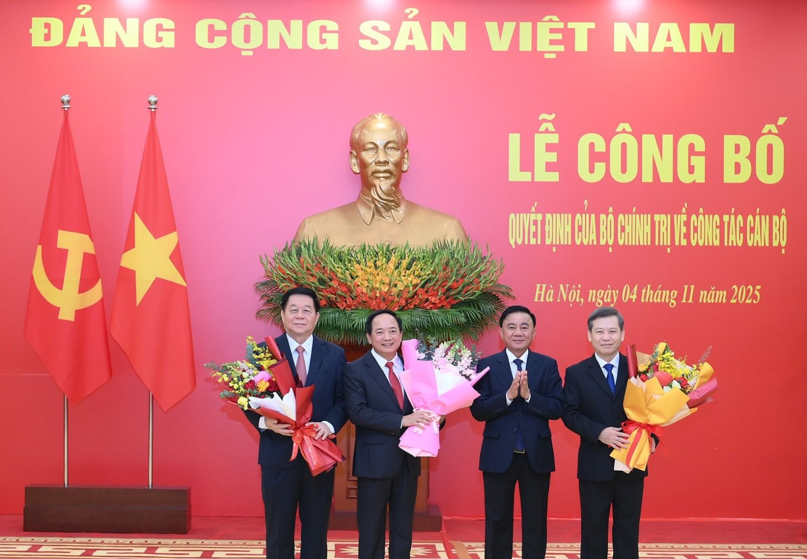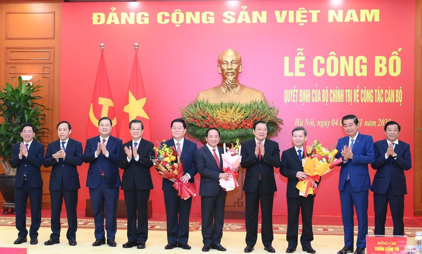 Trưởng Ban Tổ chức Trung ương Lê Minh Hưng tặng hoa chúc mừng đồng chí Nguyễn Trọng Nghĩa, đồng chí Trịnh Văn Quyết và đồng chí Lê Minh Trí.