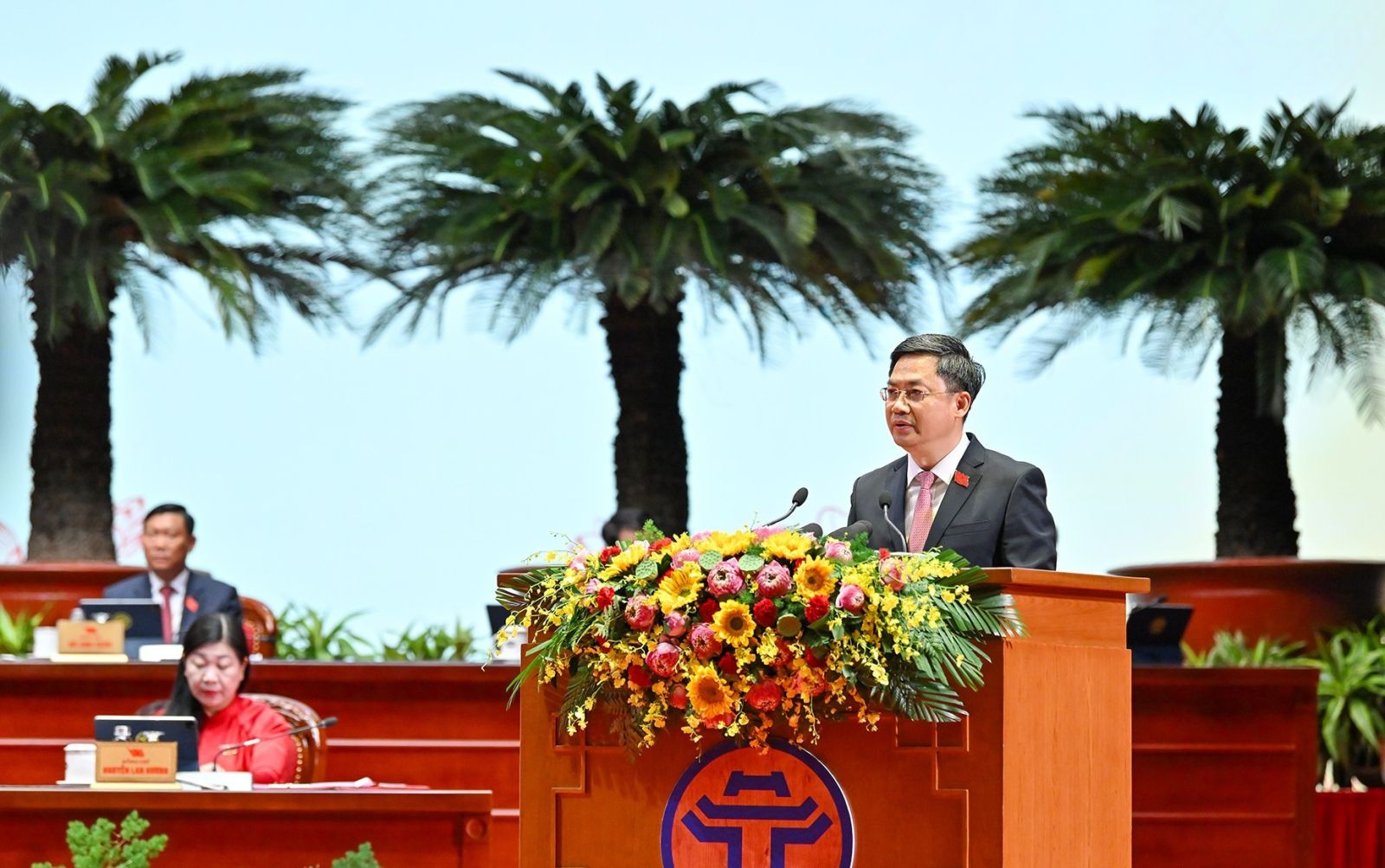Ủy viên Ban Thường vụ Thành ủy, Chủ nhiệm Ủy ban Kiểm tra Thành ủy Hà Nội Hoàng Trọng Quyết trình bày Báo cáo kết quả thẩm tra tư cách đại biểu.