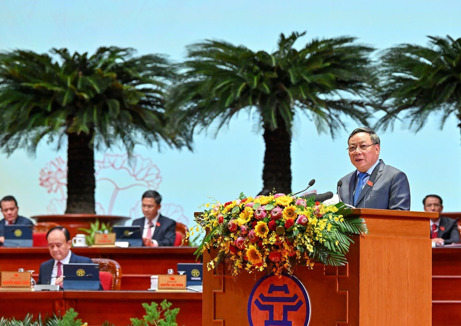 Chủ tịch UBND thành phố Hà Nội Trần Sỹ Thanh trình bày Báo cáo kiểm điểm của Ban Chấp hành Đảng bộ thành phố khóa XVII tại Đại hội.
