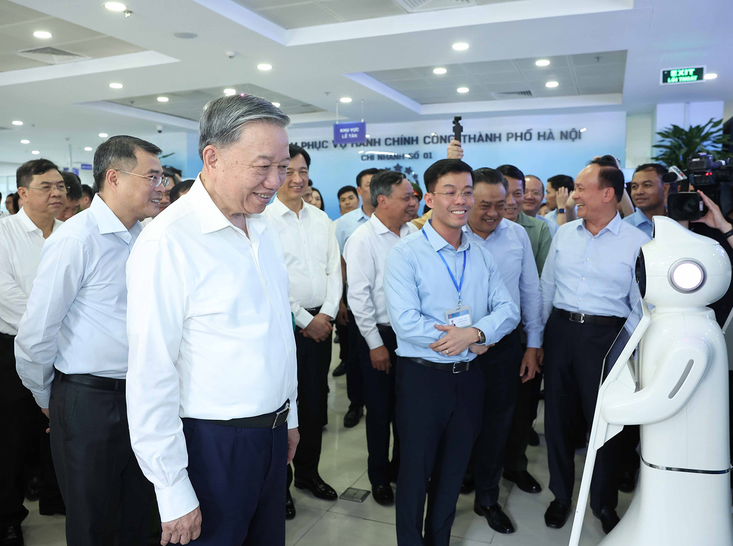 Tổng Bí thư Tô Lâm kiểm tra hoạt động tại Trung tâm hành chính công thành phố Hà Nội _Ảnh: TTXVN